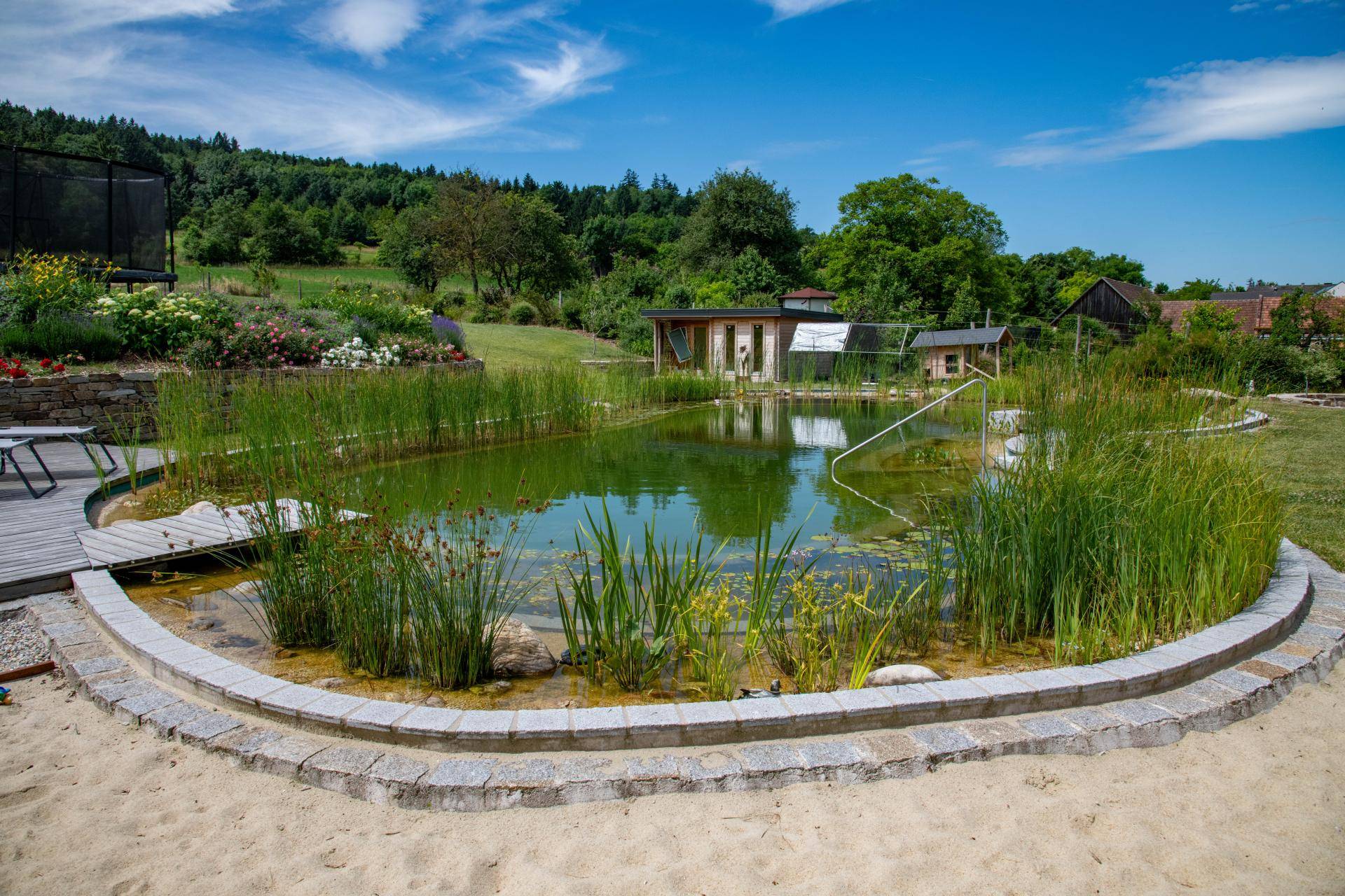 Naturnahe Wasserlandschaften mit bepflanzten Regenerationszonen schaffen ein natürliches Badeerlebnis und fügen sich sanft in den Garten ein.