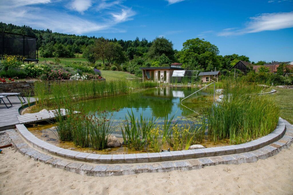 Mit der Erweiterung eines Wohnhausgartens, entstand der Wunsch nach einem Schwimmteich im Garten. Der Schwimmteich hat eine Größe von ca. 200 m². Die Badeterrasse wurde aus Lärchenholzdielen angelegt. Außerdem wurde die gesamte Gartenfläche neu bepflanzt und mit einer Bewässerung ausgestattet. Ein Sitzplatz ein Weg und ein Duschplatz wurden neu gepflastert.