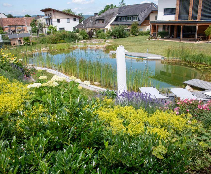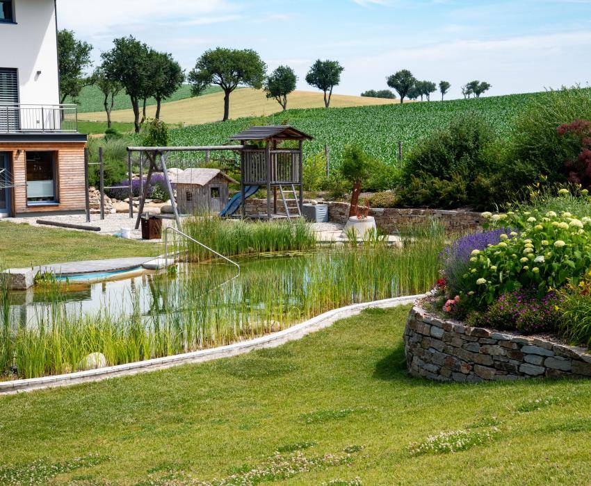 Mit der Erweiterung eines Wohnhausgartens, entstand der Wunsch nach einem Schwimmteich im Garten.