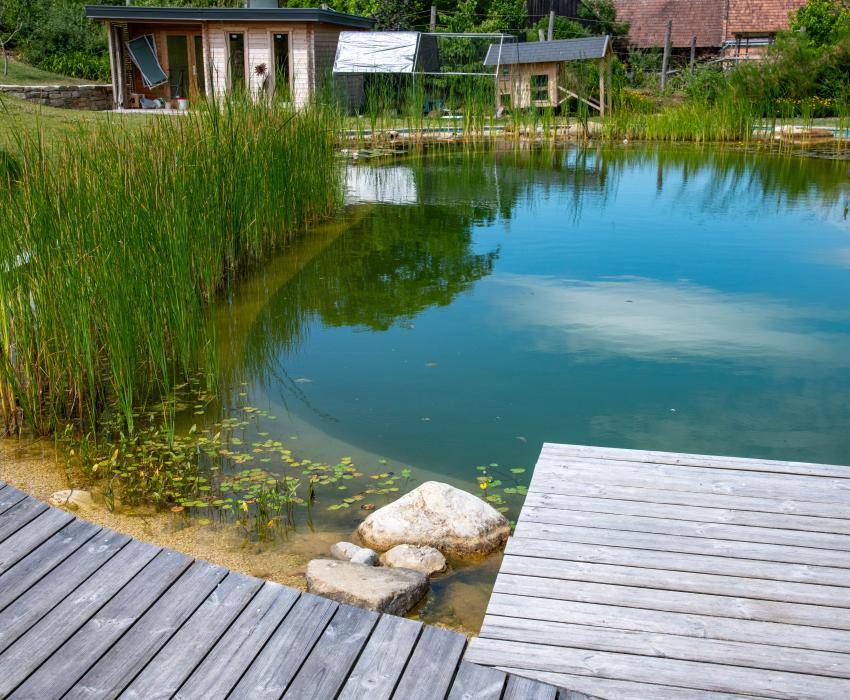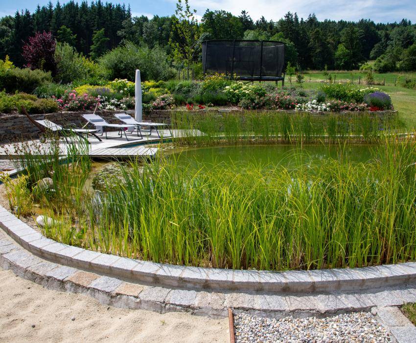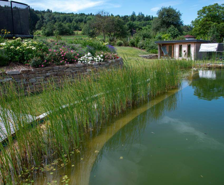 Der Schwimmteich hat eine Größe von ca. 200 m². Die Badeterrasse wurde aus Lärchenholzdielen angelegt. Außerdem wurde die gesamte Gartenfläche neu bepflanzt und mit einer Bewässerung ausgestattet. Ein Sitzplatz ein Weg und ein Duschplatz wurden neu gepflastert.
